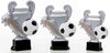 Drei graue Fußballtrophäen mit Sternenmotiven und einem Fußballschuh auf runder Basis, in der Reihenfolge von der größten zur kleinsten Größe angeordnet, verfügen über ein exklusives Design. Der Produktname lautet 3-er Serie Fußball 127 mm - 160 mm PK739410-08-3.