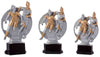 Drei silberne und goldene 3er Serie Fussball 300 mm – 450 mm PK737350-3 in unterschiedlichen Höhen, gefertigt aus hochwertigem Material, zeigen ein exklusives Design vor weißem Hintergrund.