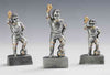 Drei Trophäen mit Fußballmotiven, auf denen lächelnde Fußballfiguren auf silbernem, rundem Hintergrund abgebildet sind. Jeder hält einen kleinen schwarz-weißen Fußball. Diese auffälligen Auszeichnungen sind unterschiedlich hoch und eignen sich daher perfekt als einzigartiges Geschenk für jeden Fußballfan, die 3-er Serie Fußball Kinder 160 mm - 200 mm PK739267-65-3.