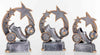 Vier Trophäen der 4er Serie Fußball 135 mm – 200 mm PK739478-4-E25 mit einem Ball- und Sterndesign auf der Oberseite, aus hochwertigem Material gefertigt, in einer Reihe mit silbernen und goldenen Akzenten präsentiert.