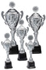 Ein Satz von zwölf Pokale Ansbach-Trophäen, jeweils mit silbernem Design und einer Höhe von 360 mm bis 720 mm, präsentiert auf weißem Hintergrund.