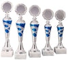 Eine Reihe aus sechs exquisiten silbernen Pokalen der Bamberg 6-er Pokalserie 208 mm – 255 mm PK758440-6-E50 mit leeren runden Plaketten an der Oberseite und einem blau-weißen Design auf der Unterseite, alle auf Marmorsockeln stehend und mit exklusivem Design aus hochwertigem Material gefertigt.