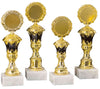 Fünf goldene Trophäen mit rotem Rand, gefertigt in exklusivem Design, jeweils auf einem weißen Marmorsockel und in unterschiedlichen Höhen abgebildet: Pokale Dachau 5-er Pokalserie 197 mm - 246 mm PK754650-5-E50.