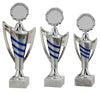 Drei silberne und blaue Pokale Dinslaken 3-er Pokalserie 213 mm – 268 mm PK759710-3-E50 mit leeren runden Plaketten, geschmückt mit Lorbeerkränzen, stehend auf Marmorsockeln unterschiedlicher Höhe.