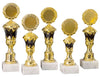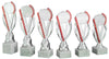 Vier Pokale Emden 4-er Pokalserie 255 mm – 300 mm PK754720-4-E50 mit roten Akzenten und unterschiedlicher Höhe werden auf weißen Marmorsockeln präsentiert.
