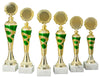 Fünf identische Pokale Göppingen 5-er Pokalserie 195 mm - 241 mm PK754780-5-E50 mit einem Marmorsockel und einem spiralförmigen silbernen und grünen Design in einer Reihe angeordnet, zeigen ein exklusives Design aus hochwertigem Material.