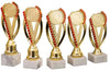 Fünf Pokale Kleve 5- er Pokalserie 255 mm – 308 mm PK754680-5-E50 mit dekorativen Mustern, jedes mit einer leeren, runden Silberplakette, die in einer Reihe auf weißem Hintergrund angeordnet ist.
