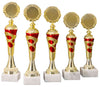 Vier silberne und rote Pokale der Leonberg 4-er Pokalserie 255 mm – 300 mm PK754730-4-E50 mit runden Spitzen und komplizierten Designs stehen auf weißen Marmorsockeln und präsentieren ihr hochwertiges Material und ihr exklusives Design.