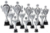Fünf silberne Pokale in unterschiedlichen Größen mit schwarzem Sockel und exklusivem Design, angeordnet auf weißem Hintergrund.