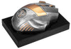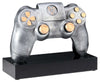 Ein silberner Gamecontroller Trophäe Controller 140 mm x 165 mm PK739675-62593-E25-G mit goldenen Akzenten, montiert auf einem schwarzen rechteckigen Sockel, perfekt als besonderes Geschenk oder Zeichen der Ehre.