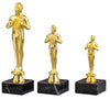 Drei bronzefarbene Adlerstatuen mit ausgebreiteten Flügeln, montiert auf schwarzen Sockeln. Diese eleganten Siegersadler der 3er-Serie 205x190 mm - 300x310 mm PK737253-51-3 werden in dynamischen Posen im Flug dargestellt und eignen sich daher perfekt für jede Auszeichnungszeremonie.